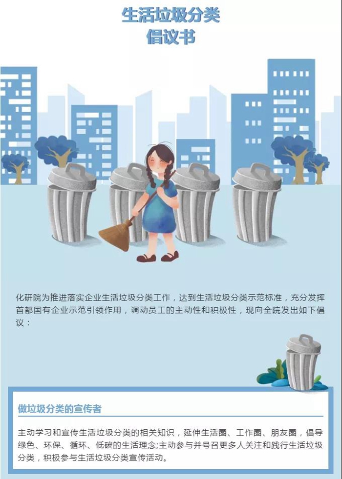化研院為充分發(fā)揮首都國(guó)有企業(yè)在“推進(jìn)落實(shí)企業(yè)生活垃圾分類工作,達(dá)到生活垃圾分類示范標(biāo)準(zhǔn)”工作中示范引領(lǐng)作用,向全院干部職工發(fā)出了做好垃圾分類的倡議書。