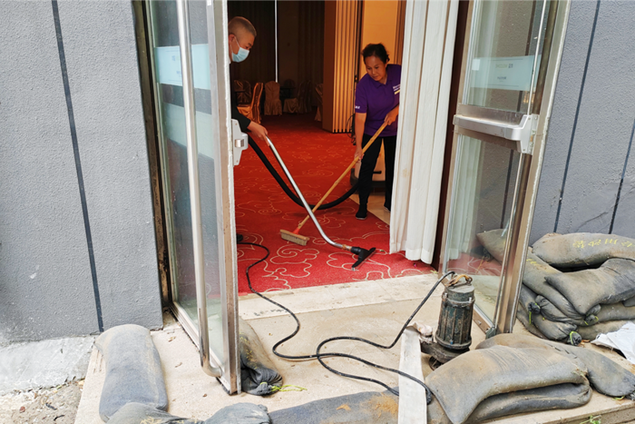 接到指令的工程部人員攜帶搶險(xiǎn)排澇設(shè)備:潛水泵、防水線軸、排水水帶趕到現(xiàn)場(chǎng),迅速開展排澇搶險(xiǎn)工作;接到搶險(xiǎn)指令的客房部人員攜帶吸水機(jī)、舊布草、拖把隨即到達(dá)現(xiàn)場(chǎng),對(duì)室內(nèi)殘存的積水進(jìn)行了處理。最終,在參與搶險(xiǎn)的各部門人員的通力合作下,“內(nèi)澇險(xiǎn)情”得到了有效控制,保護(hù)了酒店財(cái)產(chǎn)不受損失。此次演練圓滿成功,達(dá)到了預(yù)期效果。