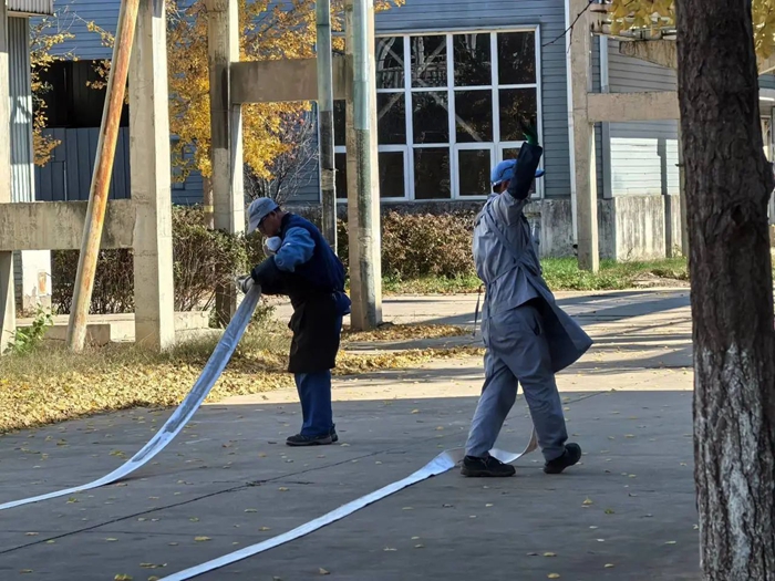 此外,在安全人員的組織下,干部職工還在消防水帶演習場所,現(xiàn)場連接消防水帶,實際演習了用消防水帶滅火的過程。
