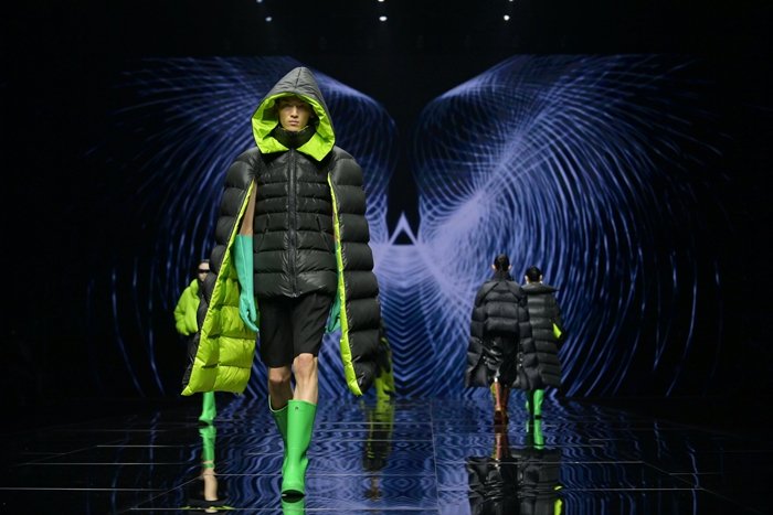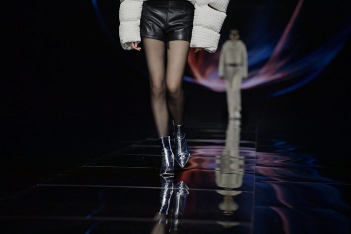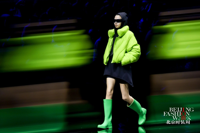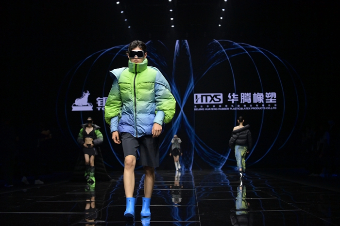 整個秀場,靚麗前衛(wèi)的膠靴或踏于足下,或成為時尚新品挎于體側(cè),伴著強(qiáng)勁的樂曲,綻放出化工科技在時尚前沿的另類美學(xué)。