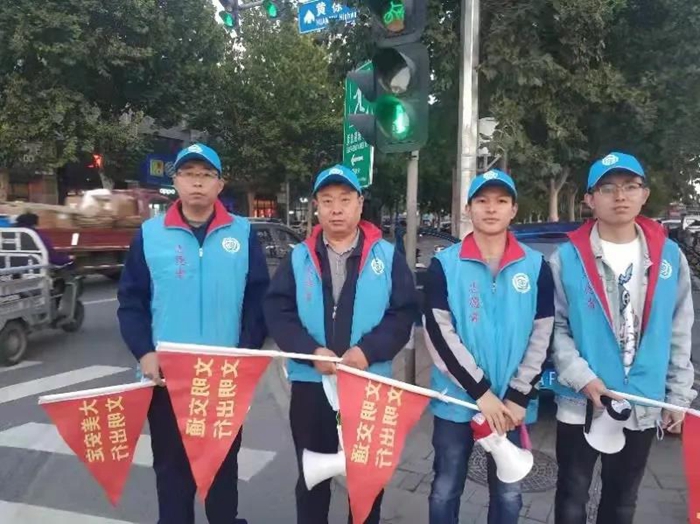 在開展文明交通勸導(dǎo)過程中,青年志愿者們身穿醒目的反光背心,戴好防護口罩,手持“文明交通從我做起”引導(dǎo)旗,配合路口執(zhí)勤交警和協(xié)管員維護交通秩序。