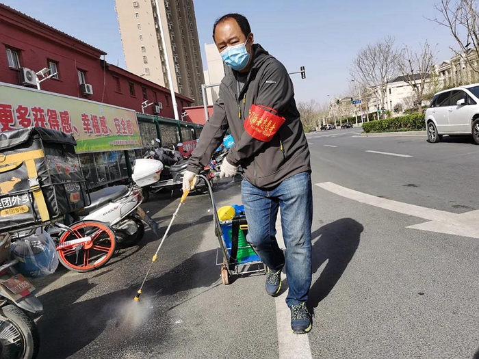 社區(qū)防疫值守工作是我們國家疫情防控的重要手段之一,消殺工作也是對社區(qū)值守人員、進(jìn)出居民健康防疫保障的有效舉措。為了保證消毒效果,我每天到崗后,都會第一時間進(jìn)行消殺。小到社區(qū)出入口的消毒腳墊,大到返京人員必經(jīng)的登記崗?fù)ざ际嵌ㄆ谙麣⒌闹攸c(diǎn)區(qū)域。還有卡口執(zhí)勤地面,乃至外賣電動車的停放區(qū)我都要讓我的“戰(zhàn)友”光顧一遍。