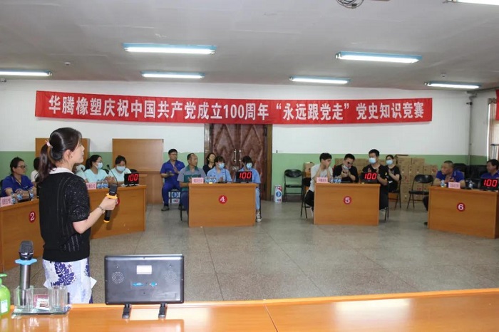 6月22日,華騰橡塑公司黨委舉辦“永遠(yuǎn)跟黨走”黨史知識(shí)競賽。活動(dòng)旨在以賽促學(xué),以學(xué)促干,激勵(lì)廣大黨員干部滿懷信心邁進(jìn)建設(shè)行業(yè)領(lǐng)先的科技創(chuàng)新型企業(yè)新征程。此次競賽共有8個(gè)黨支部組隊(duì)參加。各黨支部書記、支部委員、入黨積極分子、共青團(tuán)員、群眾代表參加活動(dòng),并參與觀眾答題環(huán)節(jié)。