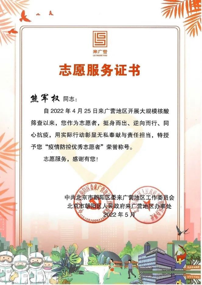 我真心地感謝北京化工集團(tuán)、華騰東光公司領(lǐng)導(dǎo)給予了我這樣一次難得的、意義深遠(yuǎn)的志愿服務(wù)機(jī)會(huì),公司黨總支、工會(huì)還給我送來了慰問和溫暖。如果再有這樣的機(jī)會(huì),我依然會(huì)積極去服務(wù),盡自己的努力為身邊的人做一些力所能及的事。我志愿,我快樂,請(qǐng)組織放心,請(qǐng)領(lǐng)導(dǎo)放心,為了北京的平安,為了社區(qū)的平安,作為國(guó)企職工,我一定堅(jiān)持到底,戰(zhàn)斗到底,直到北京全面清零,共創(chuàng)我們的美好家園。