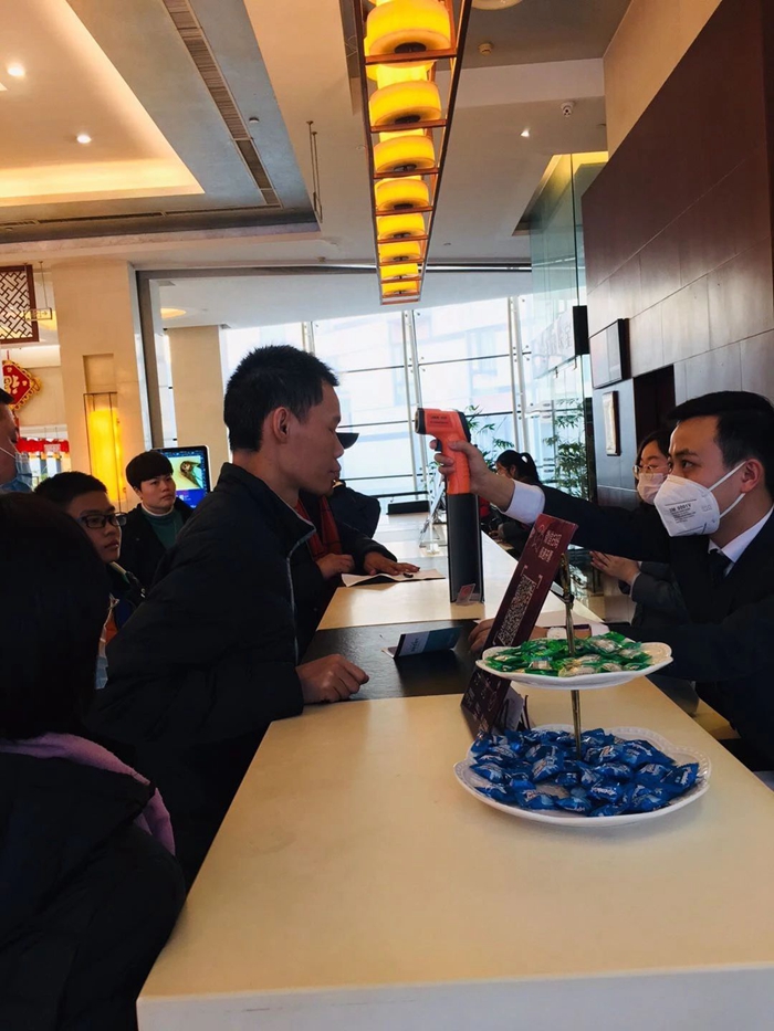 酒店對公共區(qū)域每一小時進(jìn)行全面消毒并做好記錄,提高消毒消殺頻次,加大對客房區(qū)域消毒通風(fēng)力度;同時在酒店大堂進(jìn)出口設(shè)置賓客體溫檢測點(diǎn)。