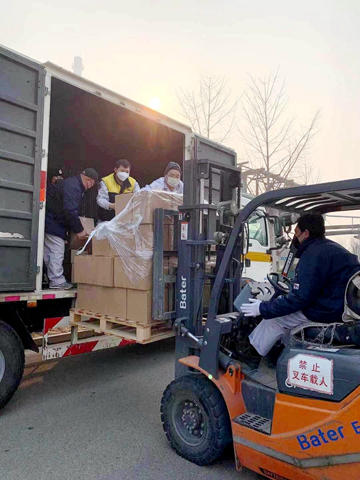 2月14日,全市普降大雪,當(dāng)天又新運(yùn)到5000箱500ml裝消毒酒精,華騰化工的職工們?nèi)吮Ъ缈浮⒚把┩瓿闪诵盾嚾蝿?wù)。