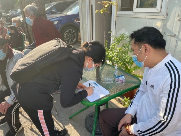 共產(chǎn)黨員宋文迪在通州區(qū)潞邑街道龍旺莊社區(qū)參加核酸檢測現(xiàn)場秩序維護或信息錄入工作。