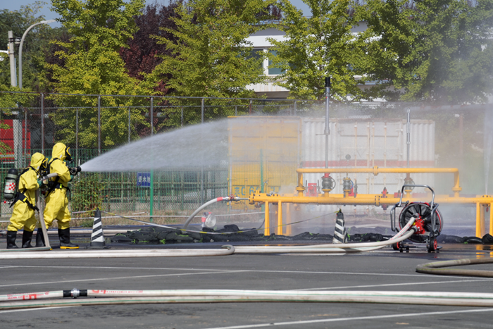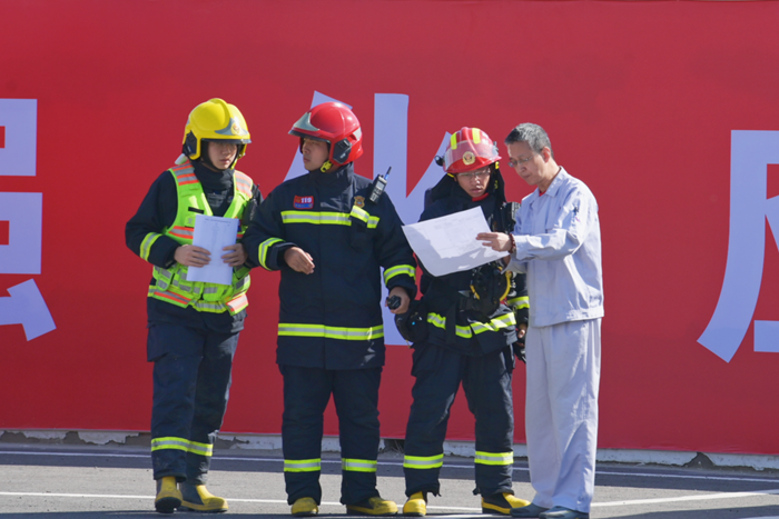 演練緊張而有序,周邊有毒有害氣體濃度監(jiān)測和偵檢、事故現(xiàn)場火災撲救、空氣中可燃氣體和有毒有害氣體濃度稀釋、泄漏危險化學品輸送管道堵漏……環(huán)環(huán)相扣、環(huán)環(huán)跟進。