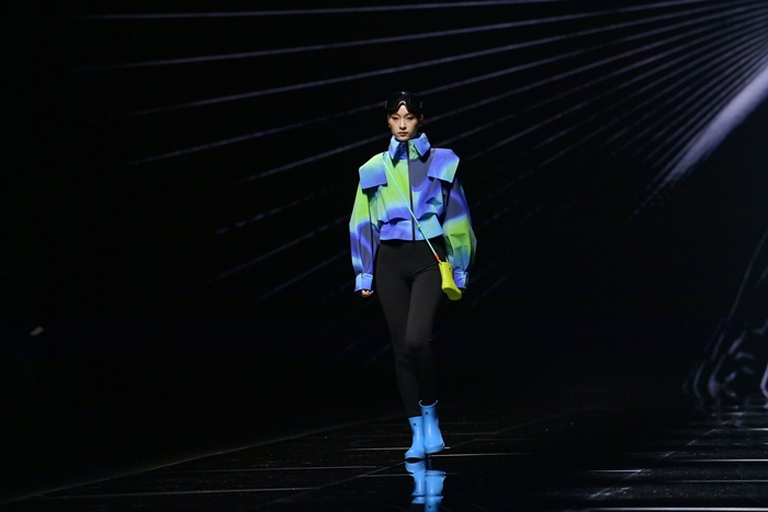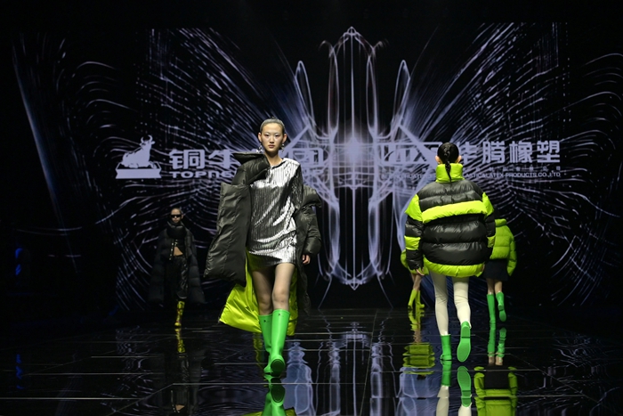 整個秀場,靚麗前衛(wèi)的膠靴或踏于足下,或成為時尚新品挎于體側(cè),伴著強(qiáng)勁的樂曲,綻放出化工科技在時尚前沿的另類美學(xué)。