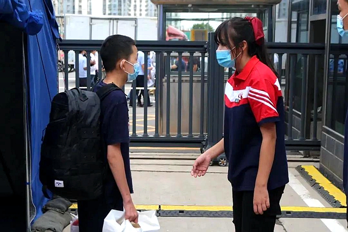 學(xué)生進(jìn)入班級(jí)后再次檢查體溫,確認(rèn)同學(xué)們的健康狀況。