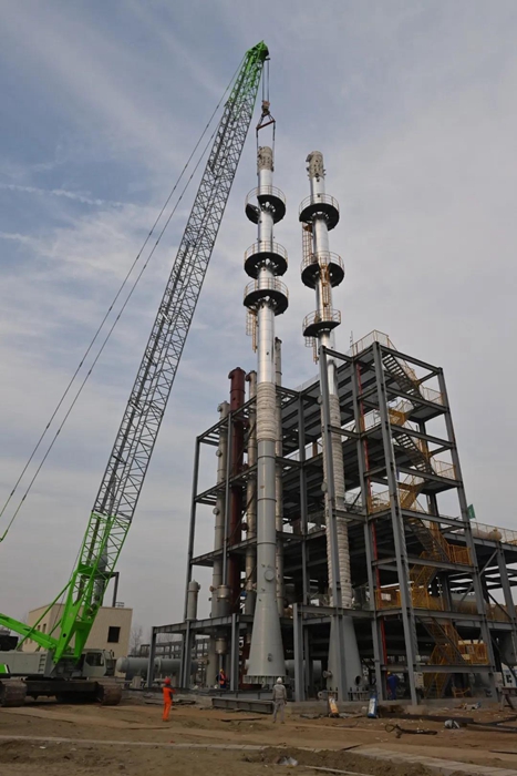 兩座精餾塔中的單體精餾單元,高達(dá)48米,是PAE(聚芳醚)項(xiàng)目最高裝置。為高質(zhì)量完成吊裝任務(wù),京騰昊樺干部職工統(tǒng)一協(xié)調(diào),相繼完成了基礎(chǔ)復(fù)核、標(biāo)高復(fù)核、吊裝位置復(fù)核等前期工作,并同步完成保溫層、爬梯和平臺(tái)的安裝。