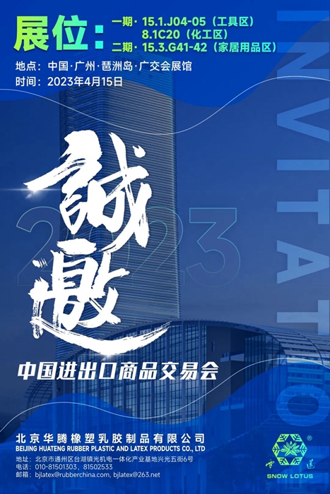 華騰橡塑繼4月15日至19日在工具區(qū)、化工區(qū)參加第一期廣交會后,于4月23日至27日將在第二期家居用品區(qū)設(shè)有展位。在此恭候您的到來。