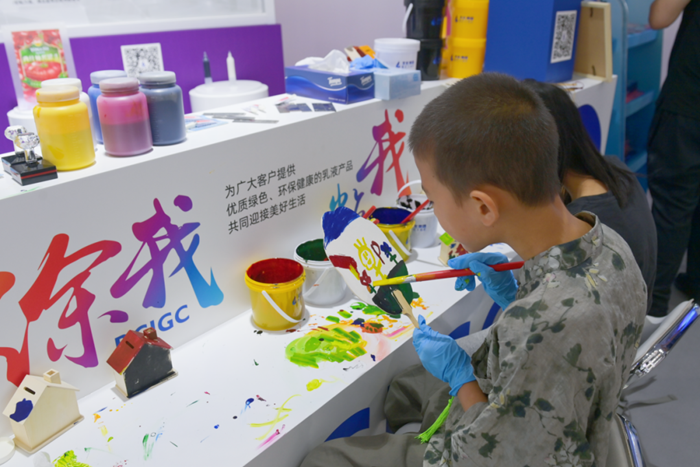 在“涂我、粘我”展區(qū),大朋友、小朋友們紛紛拿起小扇子、小木制房子,用不同的涂料在上面作畫、上顏料;在干箱手套互動區(qū),觀展者興致勃勃地套上干箱手套,模擬化學試驗操作,將試劑滴入不同化學液體中,觀察其中的變化;在防靜電手套互動區(qū),觀眾們紛紛體驗不戴手套的“麻酥”感和戴上手套后的安全感。3個互動區(qū)使觀展者在動手參與中了解產(chǎn)品的特性,對化學讓生活更美好有了切身的感受。